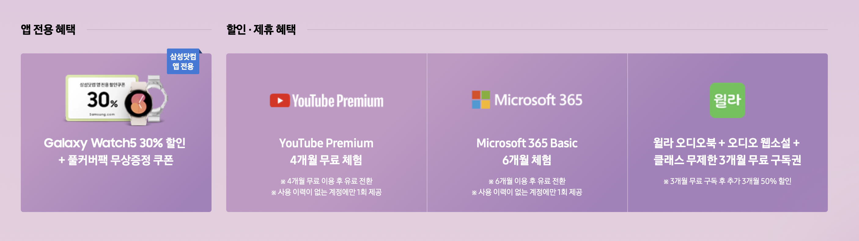 할인제휴 혜택으로 유튜브 프리미엄 4개월 무료 체험, 마이크로소프트 365 6개월체험, 윌라오디오북 웹소설 클래스 무제한 3개월 무료 구독권이 제공됩니다.
