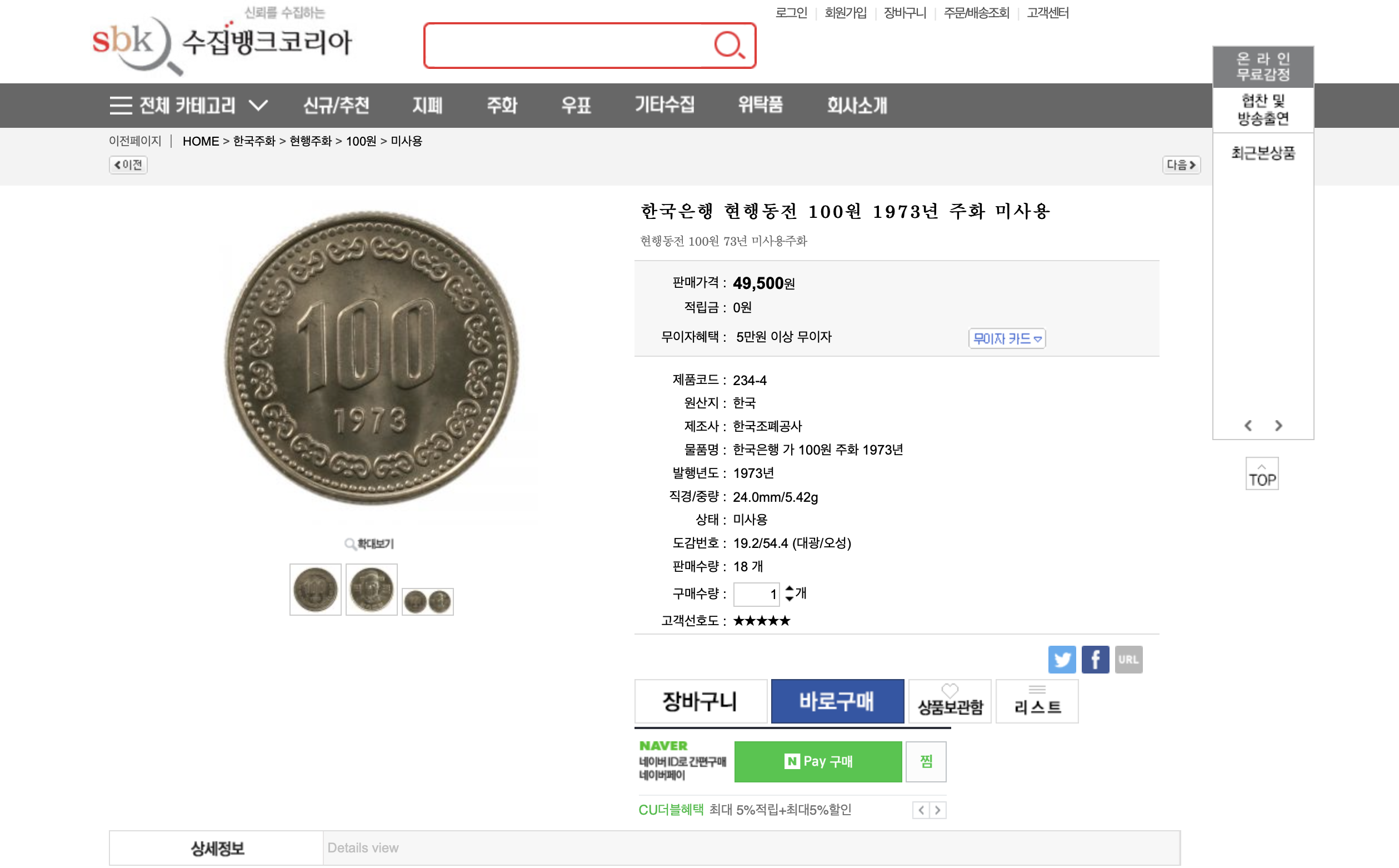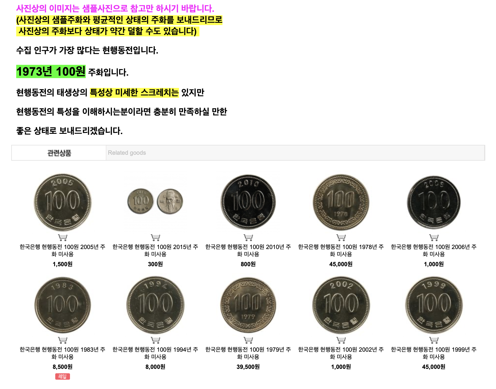 한국은행 현행동전 1973년 발행된 100원짜리 동전은 현재 2023년 49,500원에 판매됩니다.